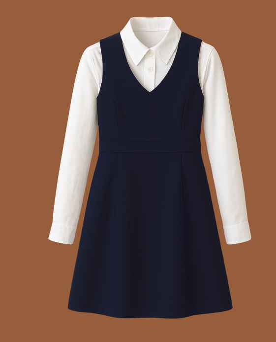 This classic two-piece school uniform combines a smart pinafore dress with a long-sleeve shirt, creating a neat and presentable look perfect for the school environment